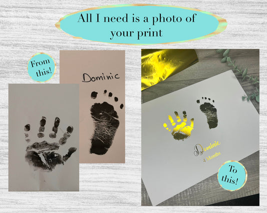 Personalised Baby hand print, foot Print in foil. New baby gift
